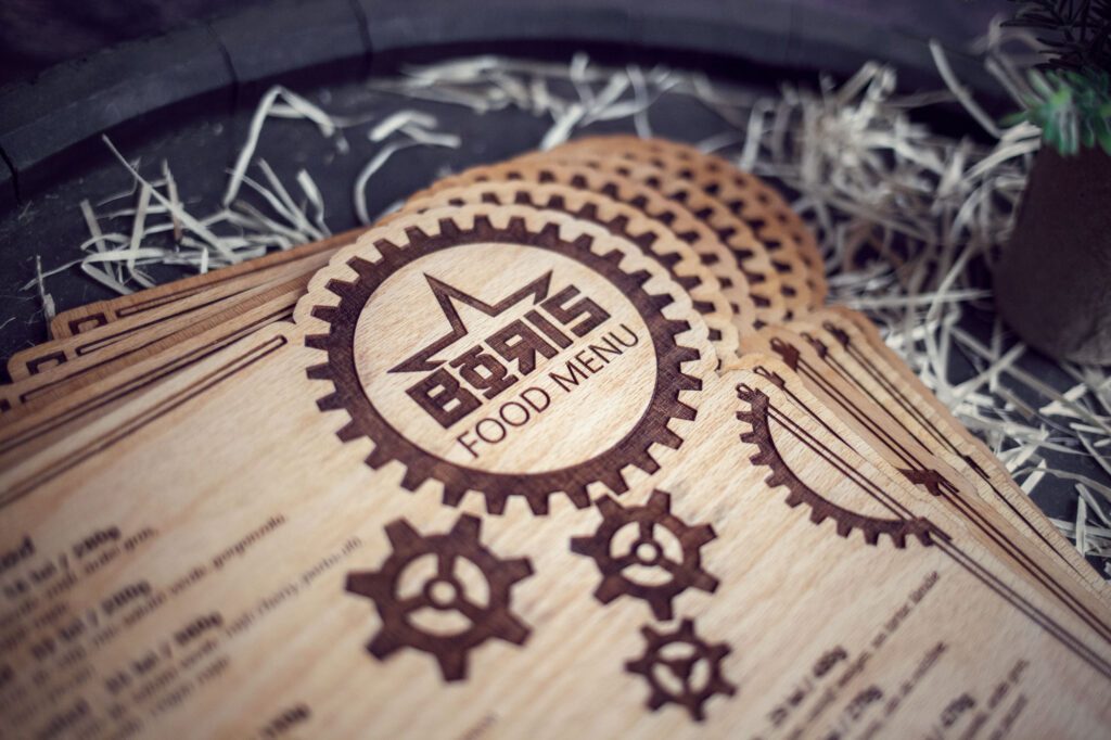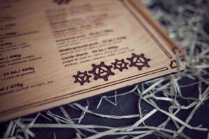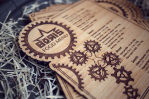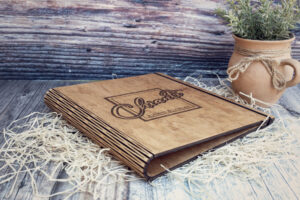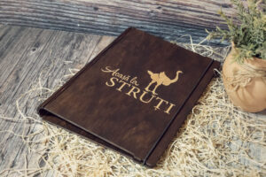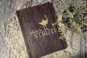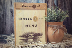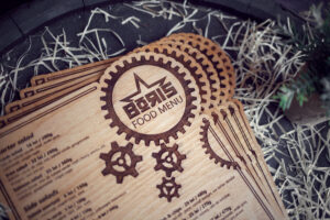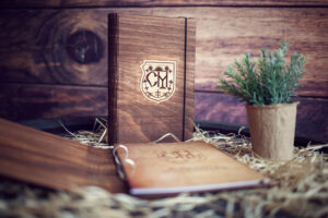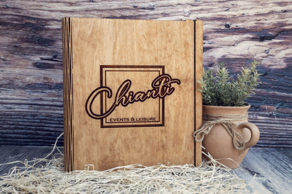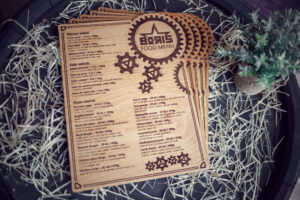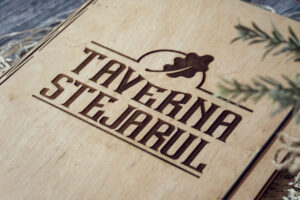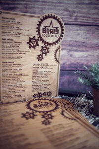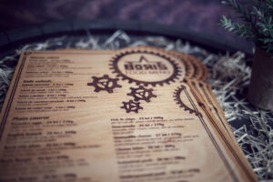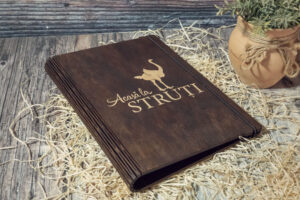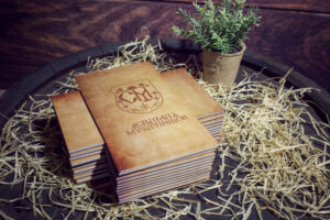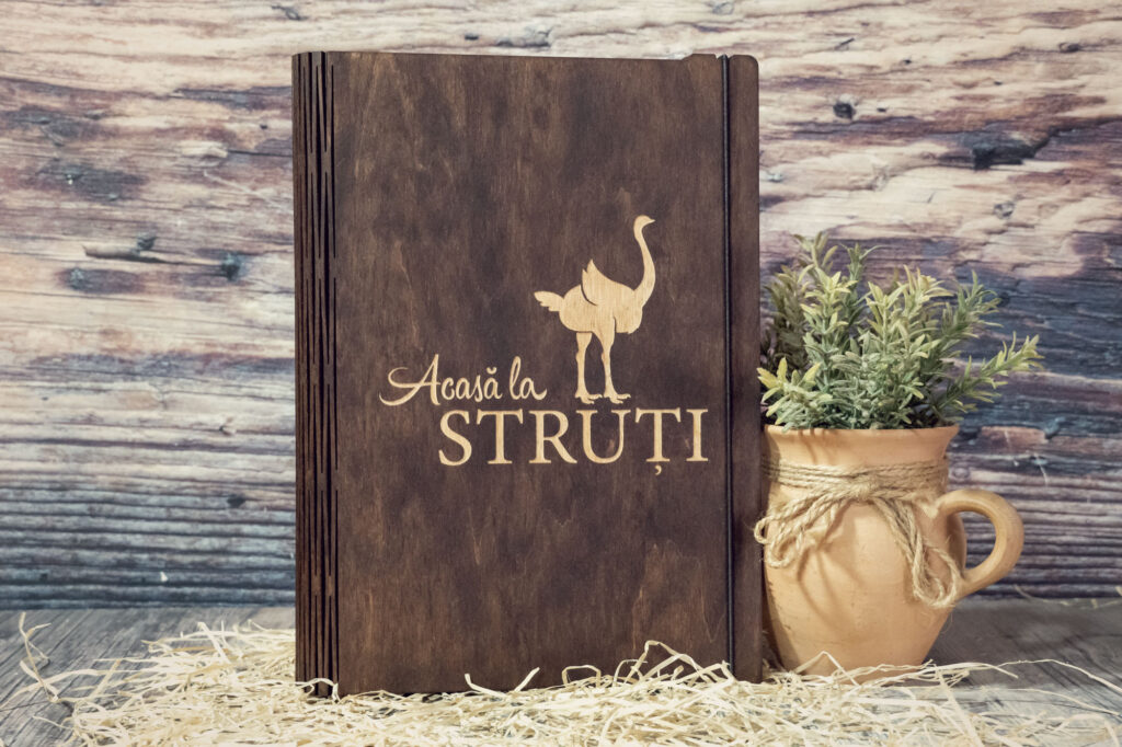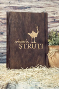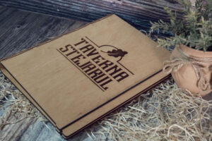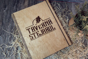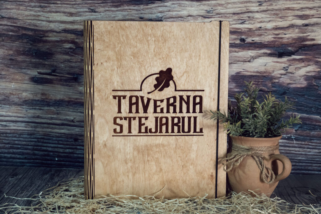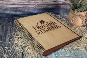 Meniuri cu coperti din lemn personalizate prin gravare cu sistem caiet mecanic, astfel se poate inlocui interiolrul ori de cate ori se doreste.