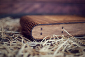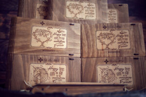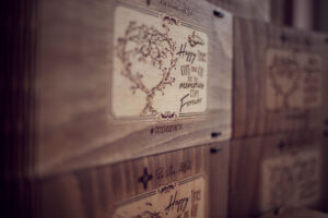 Cutie din lemn cu doua compartimente: stick USB + loc de fotografii, personalizat prin gravare, model „Randunici in copac”.